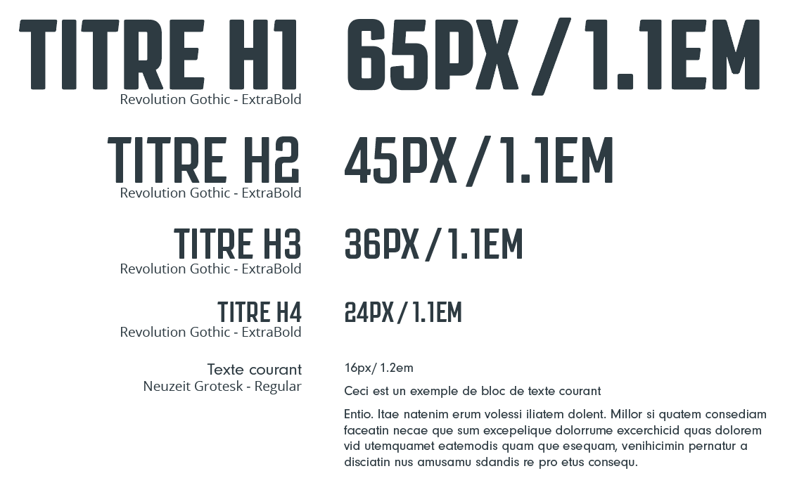 Neuzeit Grotesk, en revanche, est une police d’accompagnement idéale grâce à sa lisibilité exceptionnelle. Conçue dans les années 1920, elle fait partie des polices grotesques, qui sont des ancêtres des polices sans empattement modernes. Elle a des formes simples et équilibrées, ce qui la rend lisible aussi bien dans de petites tailles que dans des paragraphes plus longs. Sa neutralité visuelle permet de l’associer à des polices plus expressives comme Revolution Gothic sans entrer en concurrence, tout en assurant une lecture fluide et agréable. Son harmonie et son minimalisme en font une police très polyvalente dans de nombreux contextes, des interfaces numériques aux documents imprimés.