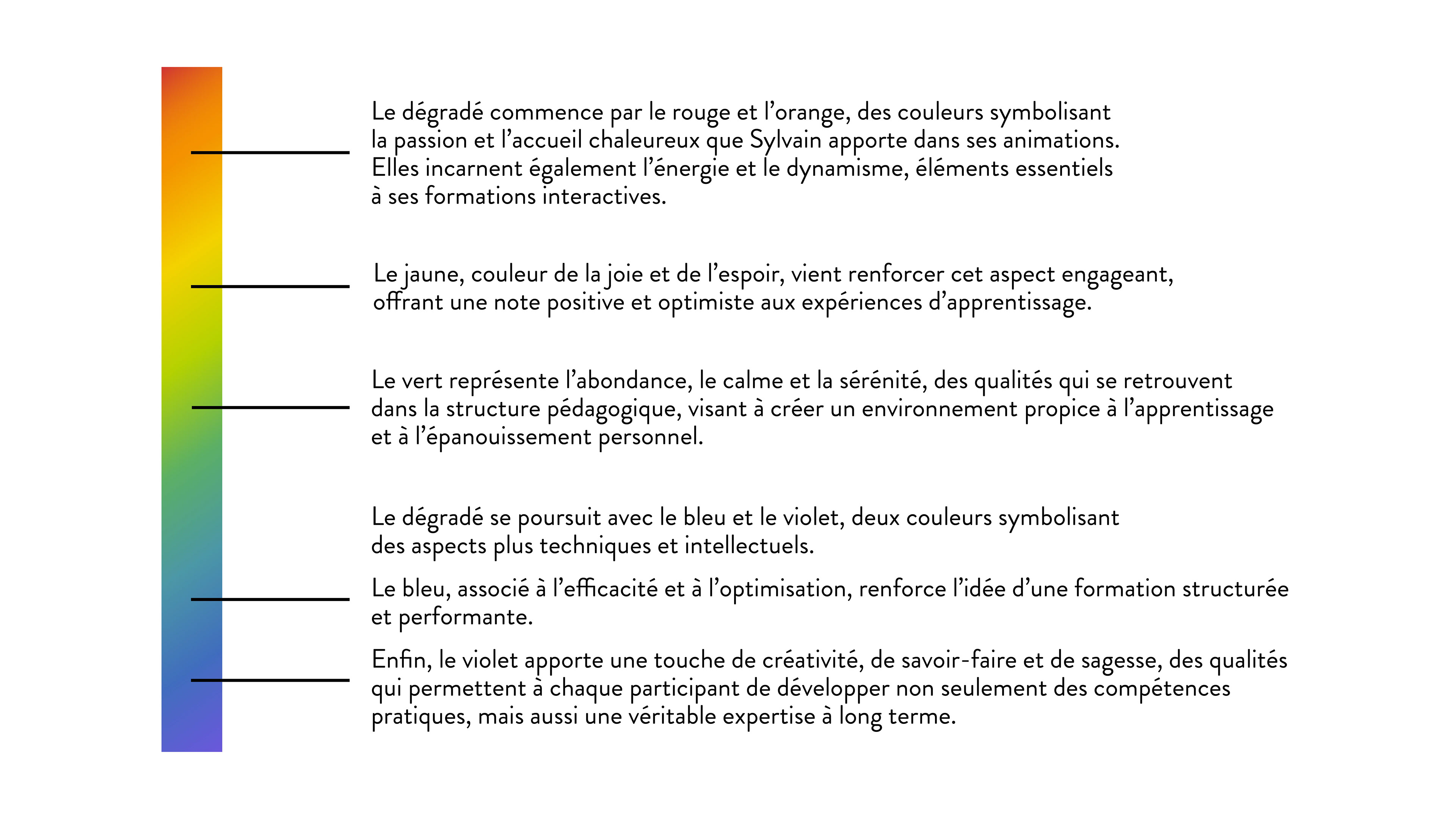 Le logo se distingue par un dégradé de couleurs vibrantes, chaque teinte apportant une signification forte en lien avec les valeurs de l’entreprise. La flèche en prolongement évoque l’accompagnement et la progression, symbolisant le soutien offert à chaque participant pour le développement de leur autonomie et de leurs compétences.
